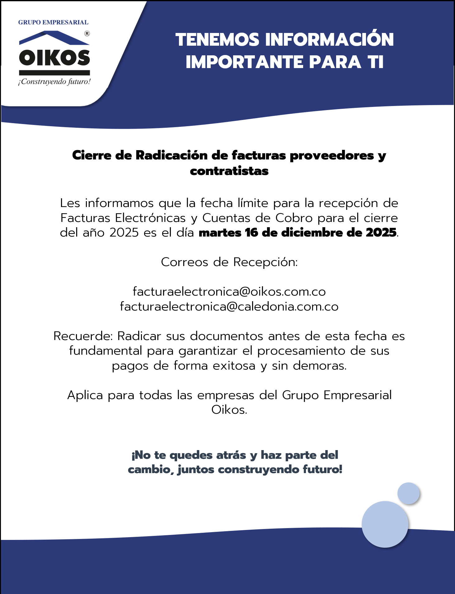 El Grupo Empresarial Oikos S.A.S les extiende la invitación a registrarse como proveedor o contratista, ya que mediante este registro ustedes harán parte de nuestro'LISTADO DE CONTRATISTAS Y PROVEEDORES CONFIABLES' el cual puede ser consultado por nuestros funcionarios desde todas nuestras obras y así continuar con los procesos de cotizaciones, licitaciones, compras y contrataciones.